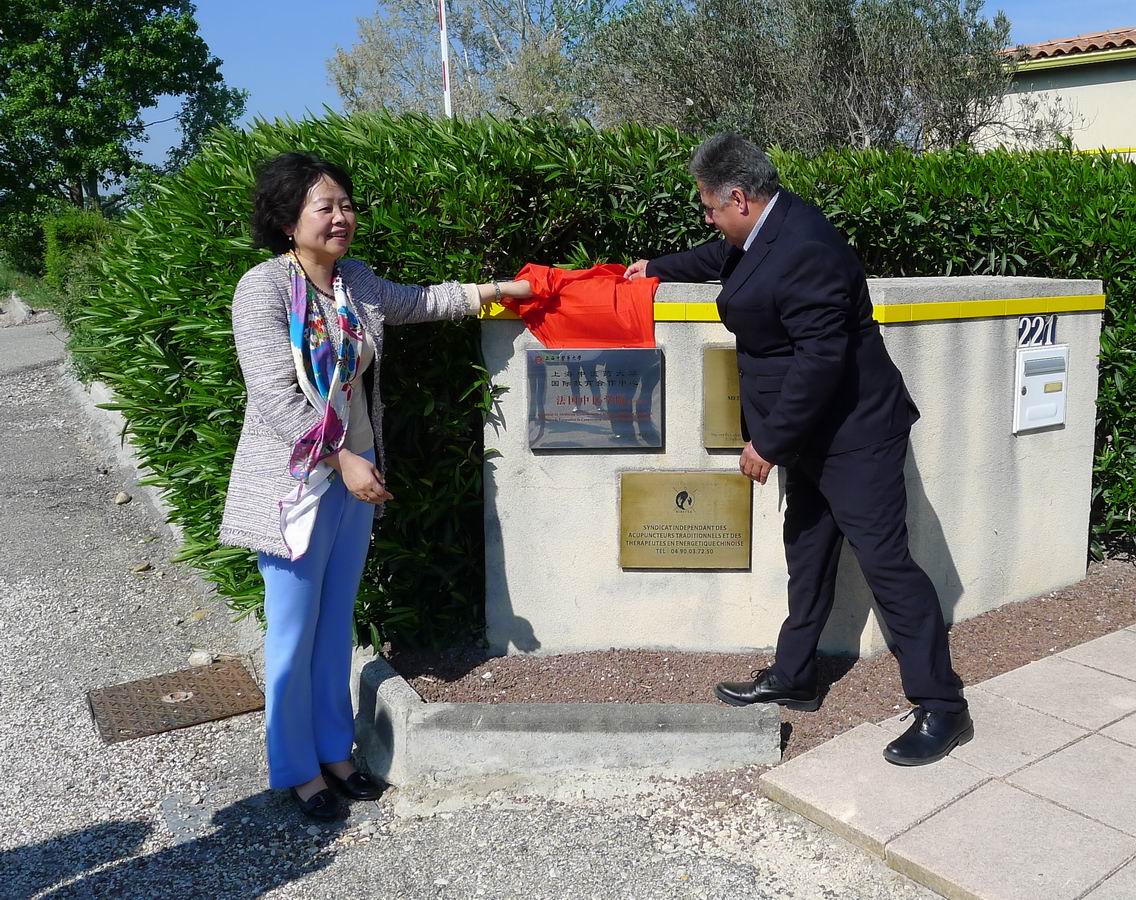 4月11日,我校在法国中医学院设立国际教育合作中心,在法国交流访问的校党委副书记施建蓉与法国中医学院院长维奈为中心揭牌。