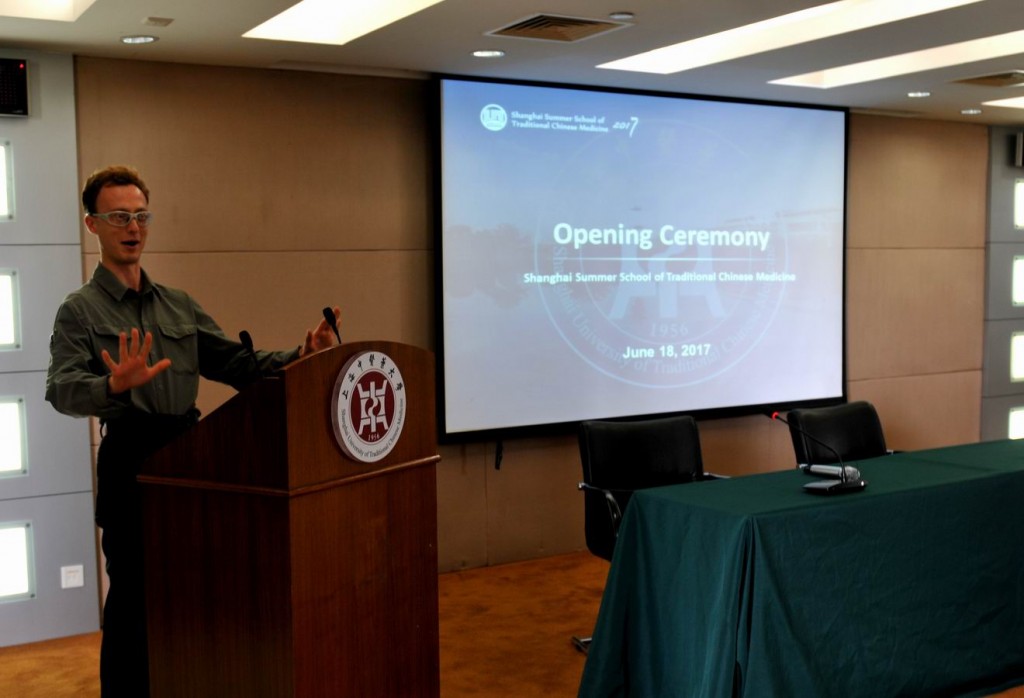 开幕式上,国际教育学院闫晓天院长致欢迎辞,欢迎来自不同国家、不同文化、不同教育背景的留学生和中国志愿者一起逐渐认识上海,也希望留学生保持对中医知识的渴求、对中国传统文化的热爱,并希望所有留学生能够将所学习到的中医知识和体验到的中国文化带回自己的国家,让中国文化、中医文化在全世界发扬光大,中医的整体医疗理念和临床优势越来越得到国际社会的认可。