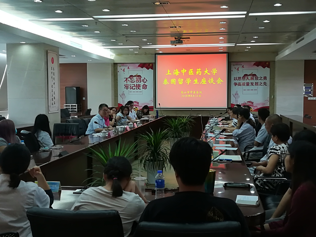814日下午,上海中医药大学国际教育学院院长林勋、中医教学中心主任沈琴峰、国际学生部主任薛靖一行三人赴昆山市中医医院召开2013级泰国华侨崇圣大学班学生实习座谈会。昆山市中医医院副院长杨菊、科教科副主任李静、辅导员孙平、临床各科室的带教老师以及2013级泰国班实习生参加座谈会。