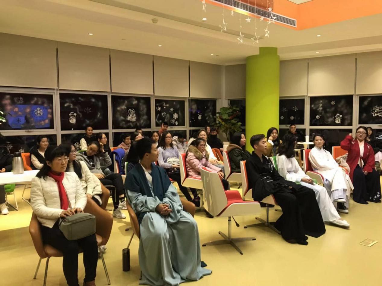 有螺旋楼梯和美丽环灯大报告厅里,来自全世界各个地区的中医药学子汇聚一堂,活动参与者包括国际教育学院的老师与学生,以及逐风诗社与茶艺社的同学还有受邀而来的中国同学,共有41本次活动由一名国际学生和中国学生搭档主持,活动开始主持人讲述本次活动的背景,引出诗词里的人生,学生们从“童年”、“青年”、“中年”、“老年”等不同人生阶段向我们细细讲述鉴赏中国诗词中的美好人生意趣。在“诗词属性猜猜猜”和“看图猜诗”的游戏环节中,学生们积极举手抢答,答对的同学得到了精心准备的小奖品,现场气氛达到了高潮。在“飞花令”的诗词游戏中,两名女同学给大家呈现了两场精彩的成语接龙。接着由来自茶艺社的两位同学献上茶艺表演大家饶有兴致地欣赏着茶艺表演,品味着同学沏出来的清茶,谈笑风生。期的诗词会友活动就在一个轻松愉快的氛围下圆满结束。