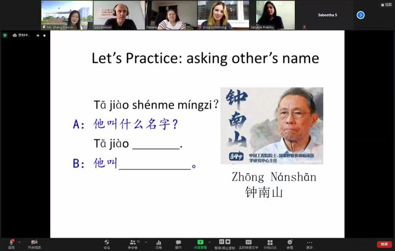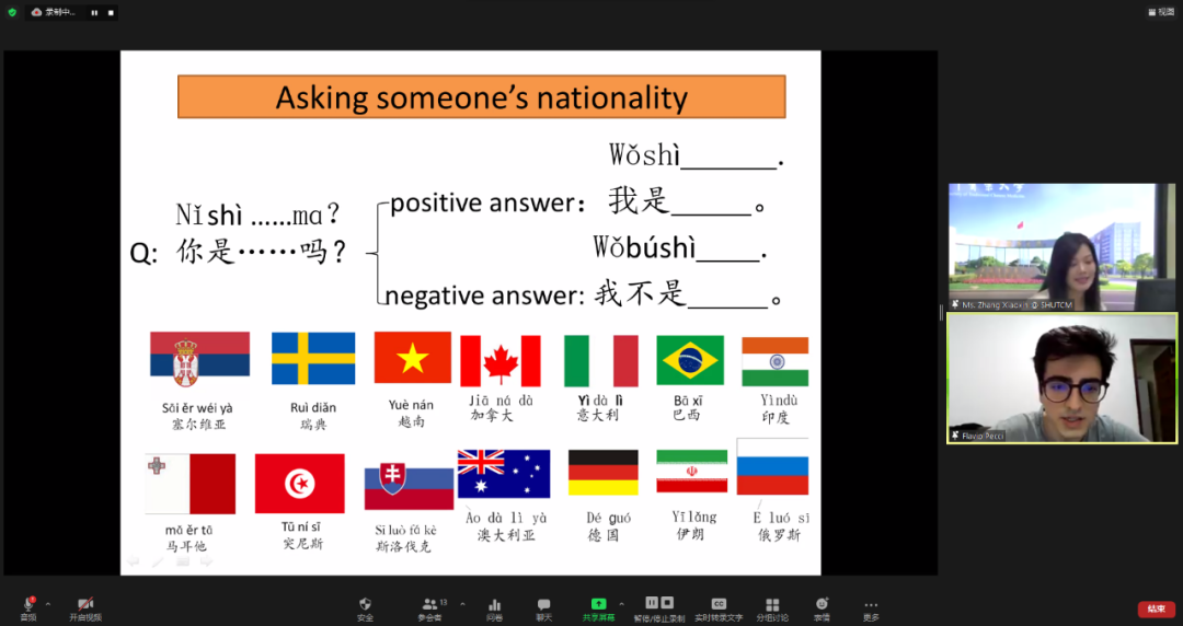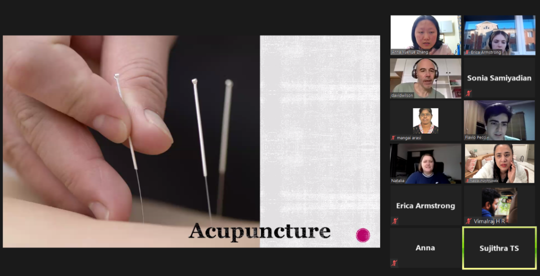 在结业仪式上,十多位学生代表分别作了结业展示汇报。其中,来自澳大利亚的David同学主要分享了阴阳、五行、脏腑等中医基础理论,展示了自己运用针灸推拿手法的照片;来自加拿大就读于东芬兰大学的Erica同学通过视频形式分享了自己练习五禽戏的过程,以及中医膳食的做法;来自巴西的Flavio同学分享了中医药在巴西的发展历史和现状。此外,各位学员还以视频和图片形式提交了自己学习剪纸、书法的过程和作品。