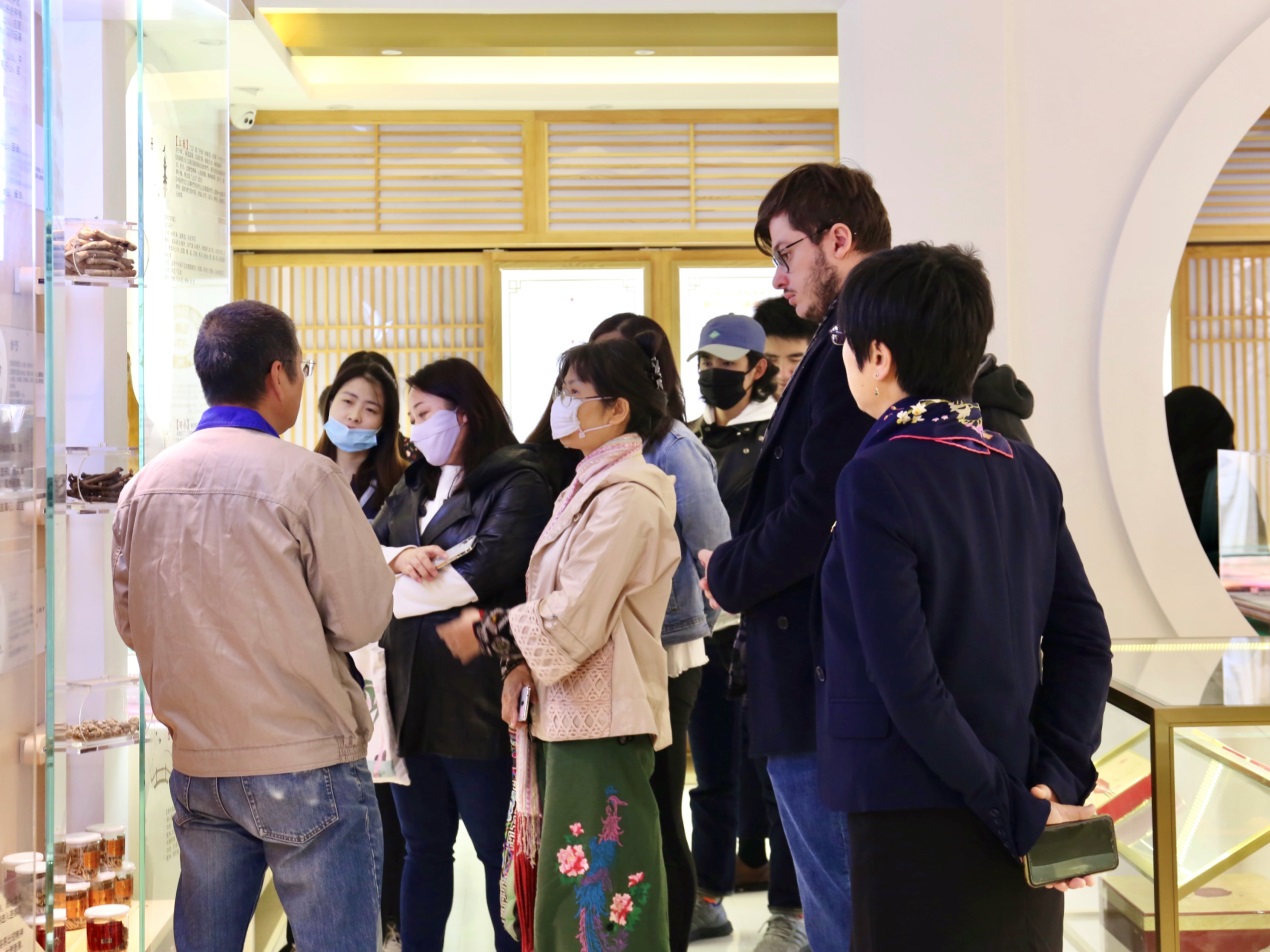 师生们首先欣赏了雷允上中药饮片厂的纪录片,了解这家中华老字号的历史沿革和现况。伴随着细致的讲解,同学们参观了雷允上诵芬中药展示体验馆,现场学习了解中药饮片的加工过程、丸散膏丹酒露汤锭八种传统剂型的制作方法、名贵中药材的鉴别、常用中药的药效和中药房的工作流程。同学们展现出了浓厚的兴趣,不断提问交流。