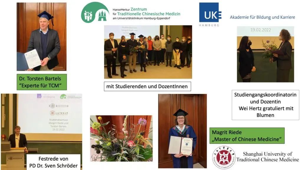 在完成三年学业,接受了针灸、推拿和药物疗法培训等六个学期的强化学习后,首批毕业生Margrit Riede和Torsten Bartels获得证书。德国汉堡大学中医中心主任、德方导师Sven Schröder教授,在致辞中说:“我为我们的第一批毕业生感到非常自豪。你们在西医方面的专业知识将通过中医的新能力得到宝贵的补充和扩展,造福于患者。”