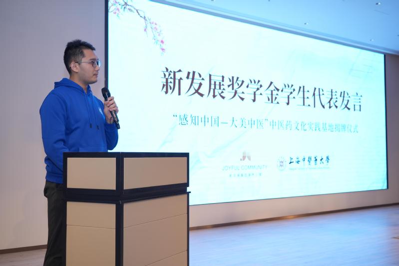 新发展集团康养小镇常务副总经理王子恪介绍了新发展康养小镇的建设模式。新发展集团康养小镇从打造之初,就集全集团之力,力争在东上海打造一片服务于全龄人群的疗愈之地,通过与各行各业优秀的伙伴的合作,推动上海的康养行业书写新的篇章。新发展康养小镇愿为国际学生提供优质的中医药实践资源。成琳代表全体师生对新发展集团的资助致谢,希望院企之间强强联手,秉持大医精诚的精神,共同描绘中医药事业的蓝图。马来西亚籍硕士研究生汪新杰作为新发展奖学金获得者代表进行发言,他表示,将在“新发展”奖学金的激励下,全心全意地投入学习,并为自己制定了明确的科研规划,并致力于将中药创新技术发扬至海外。