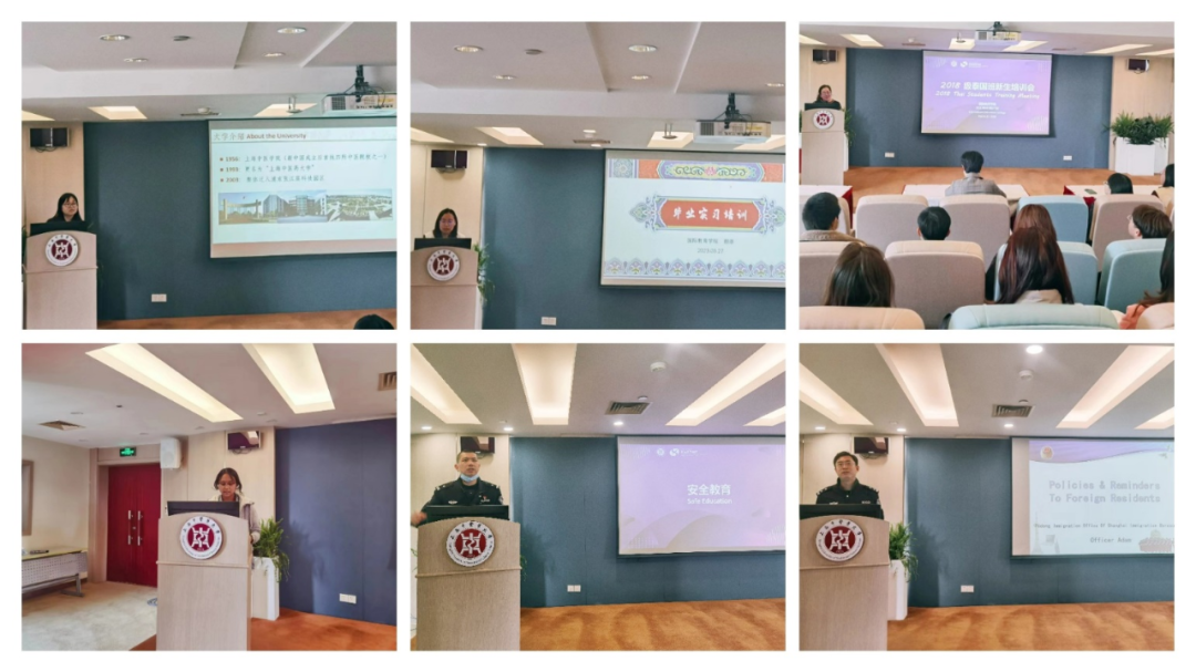 接着,颜彦副院长向泰国同学介绍毕业实习并强调了毕业实习培训计划的安排和意义。上海市公安局浦东分局出入境办公室、张江派出所警官们为泰国班同学带来了安全讲座。