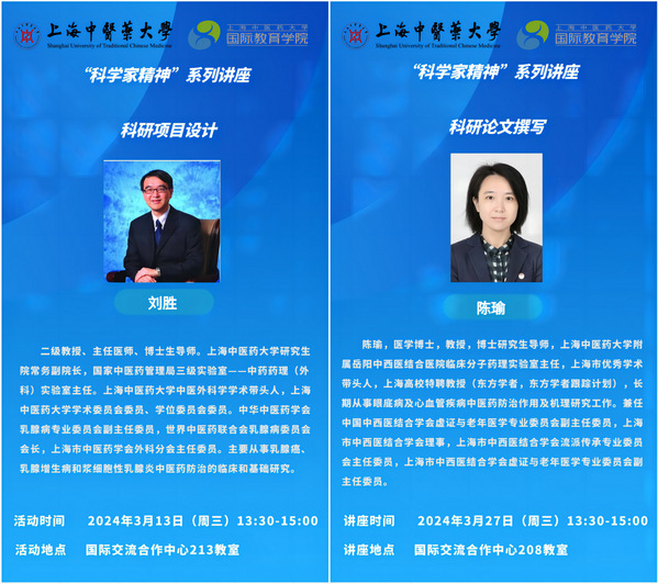 3月13日和3月27日,“科学家精神”系列讲座第一讲和第二讲顺利举行。上海中医药大学研究生院常务副院长刘胜教授和上海中医药大学附属岳阳中西医结合医院临床分子药理实验室主任陈瑜教授分别为就“中医思维指导下的中医科研项目设计”和“科研论文撰写要点和注意事项”的主题为到场的外籍研究生打开科研路上的第一扇门。