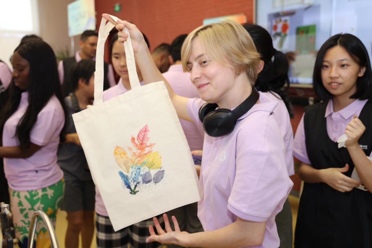 针脚细密,色调典雅,在苏绣活动板块,一幅幅绣工精湛、栩栩如生的刺绣作品吸引了国际学生们的目光。苏绣,被誉为“东方艺术明珠”,每一处细节都体现了东方匠人的精湛技艺与对美的极致追求。选线,穿针,刺绣,国际学生们在老师的指导下拿起绣针,尝试在方巾上绣出一片银杏叶,沉浸式感受江南文化的韵味。