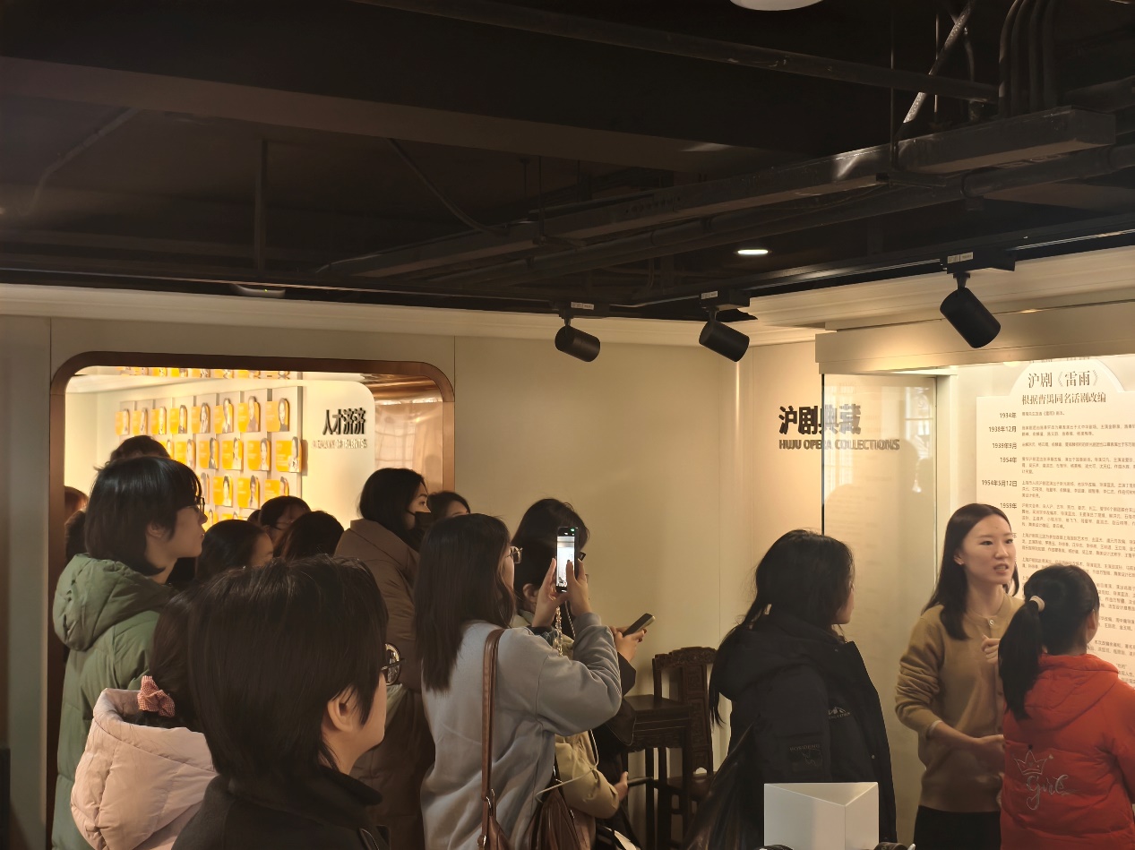 这座建于1919年的白公馆是匈牙利建筑师邬达克的早期经典之作,以法国文艺复兴风格和“沪上最美旋转楼梯”闻名;它曾是白崇禧官邸,如今则化身沪剧活态传承的文化枢纽,馆内沪剧传习馆的图文展陈勾勒出百年沪剧的发展脉络,戏曲传习的坐排空间更搭建起传统与现代的桥梁。从专业讲解到环境式沪剧片段沉浸式观摩,国际学生在建筑空间与艺术表演的双重体验中,完成了从文化感知到文化传播的身份转变。此次研学不仅让国际学生深度领略沪剧的艺术魅力,更让他们真切理解非遗活态保护的深层意义——当百年建筑迎来青春面孔,当沪剧唱腔碰撞国际视野,文化自信的种子跨越国界,在国际学生心中生根发芽,让中华文脉在跨文化交流中生生不息。