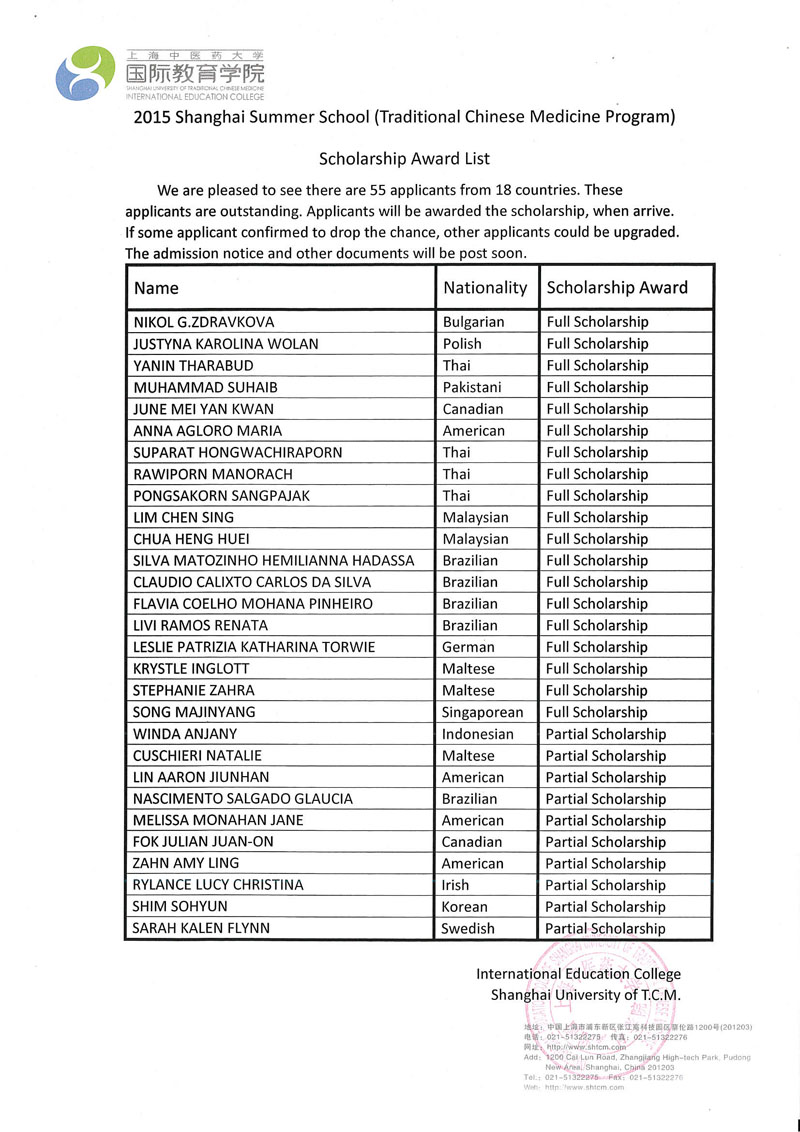 2015 Shanghai Summer School (Traditional Chinese Medicine Program) Scholarship Award List