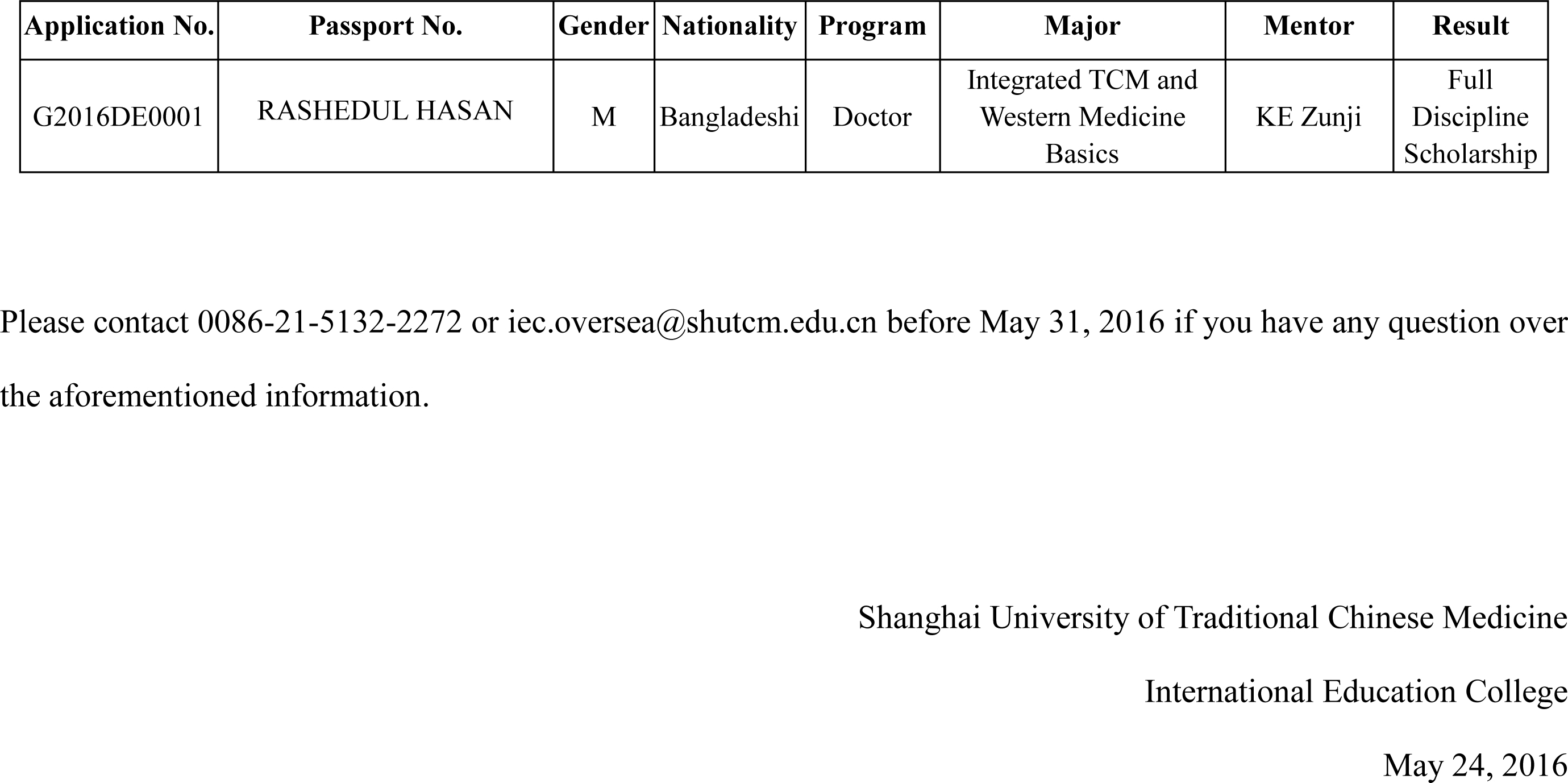 Publicity of Discipline Scholarship and Assistance Fund for Taught-English International Postgraduate Programs, SHUTCM, 2016