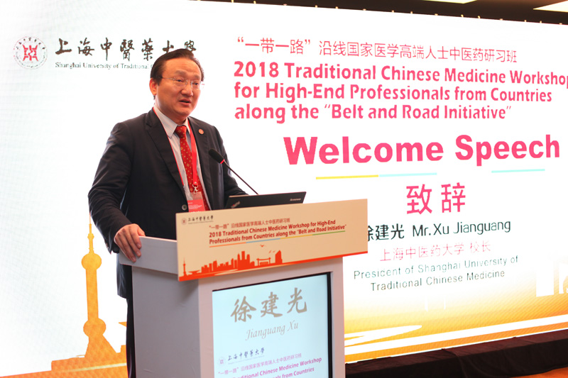 Xu Jianguang, president of SHUTCM, speaks at the 2018 Traditional Chinese Medicine Workshop for High-end Professionals from Countries involved in the Belt and Road Initiative, Oct 17.