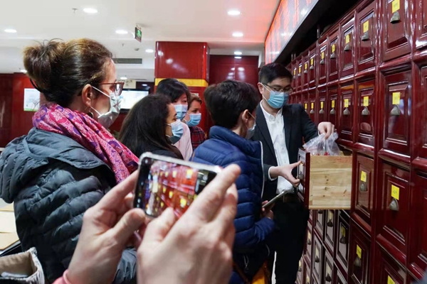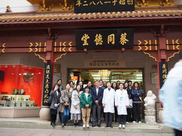 A group of 12 international students from Shanghai University of Traditional Chinese Medicine (TCM) visited the renowned Cai Tong De Pharmacy on Nanjing East Road in Shanghai on March 31.