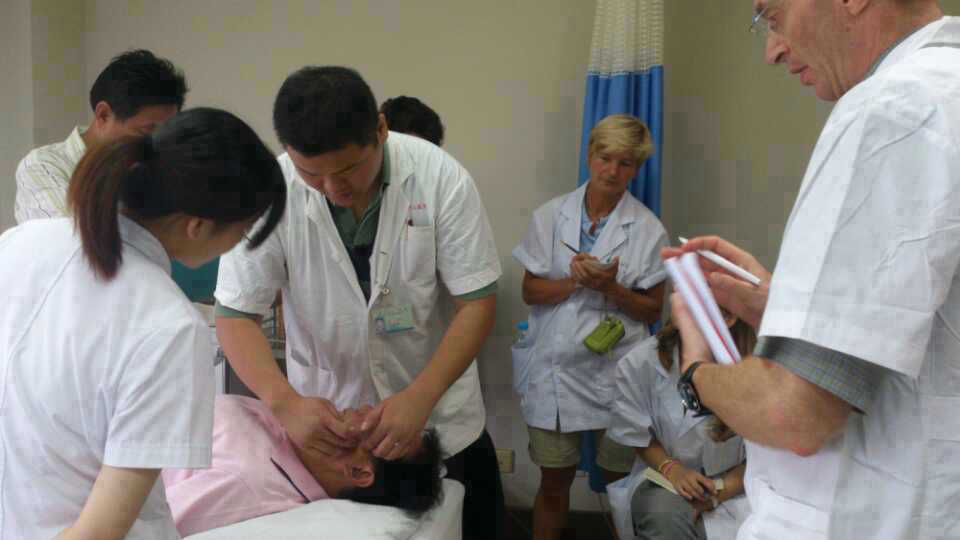 Des stagiaires belges en observation lors d’une séance d’acupuncture à l’Hôpital universitaire de Putuo.