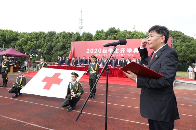 La levée du drapeau de l'Université et celle du drapeau de la Croix-Rouge se sont tenues lors de la cérémonie et ensuite tous les étudiants de première année ont fait une déclaration du serment avec le professeur CAO Xikang, secrétaire du Comité du PCC de l’université, la cérémonie s’est terminée par le chant de l’Université «Les fleurs d'abricot s’épanouissent sur le campus».