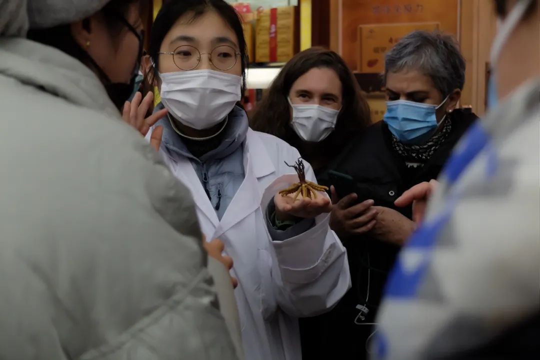La pharmacie dispose de plusieurs étages, dont chacun est dédié à une fonction particulière. Au rez-de-chaussée se vendent des produits de santé haut de gamme, parmi lesquels le ginseng et le Cordyceps Sinensis sont les plus demandés. La guide a montré un échantillon de ce dernier et en a expliqué la particularité, le processus de traitement et les effets. Ces produits sont utilisés pour le maintien de la santé ou comme tonifiants.