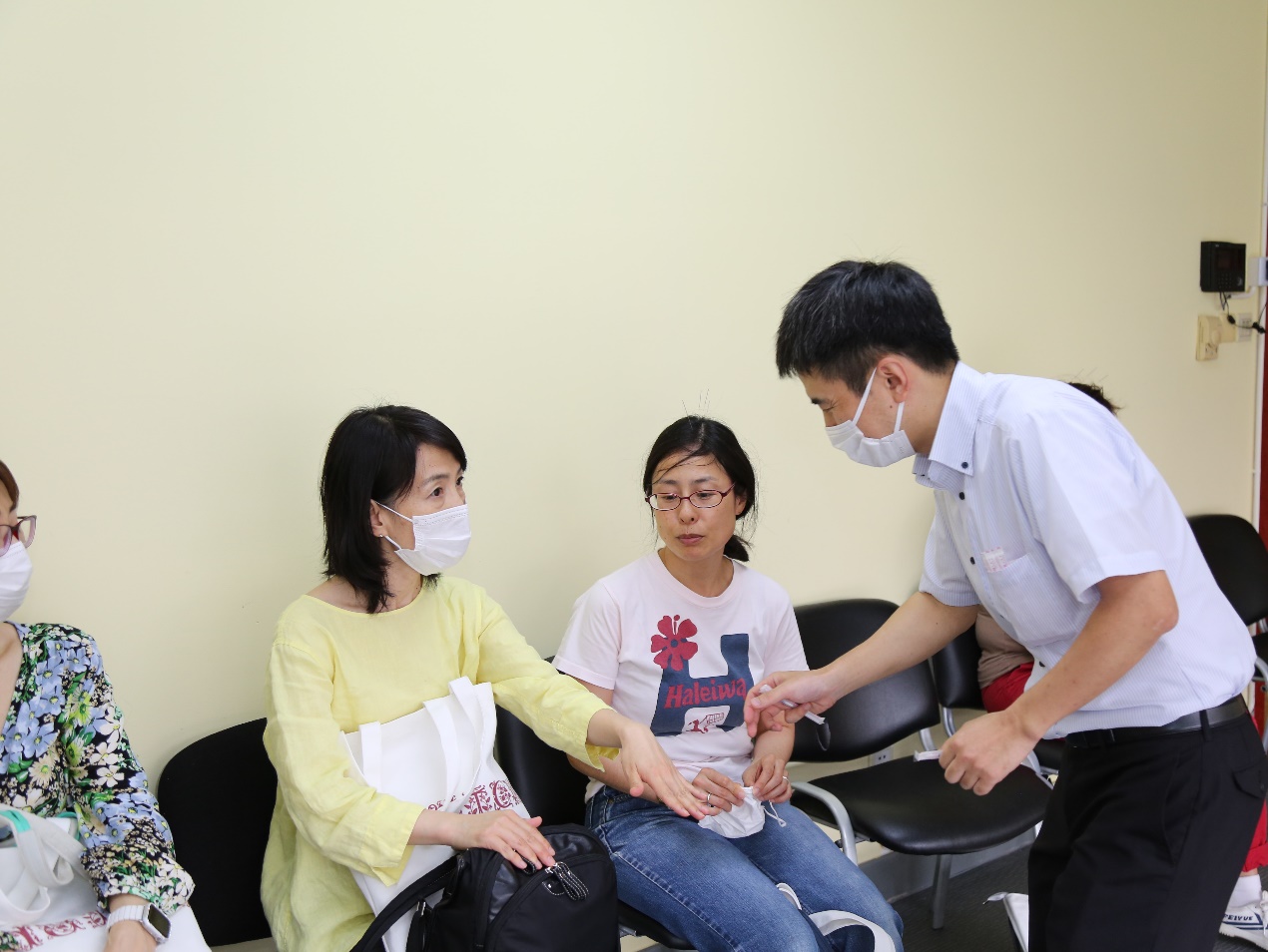 鍼灸の先生は施術前に体験者の具合を聞いています。