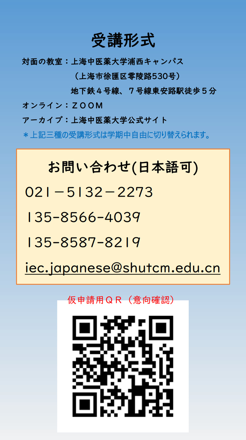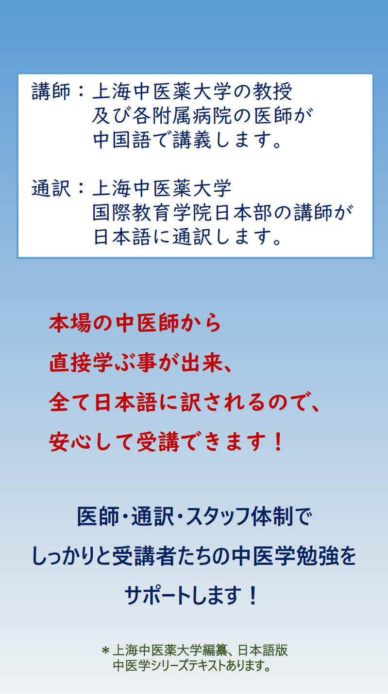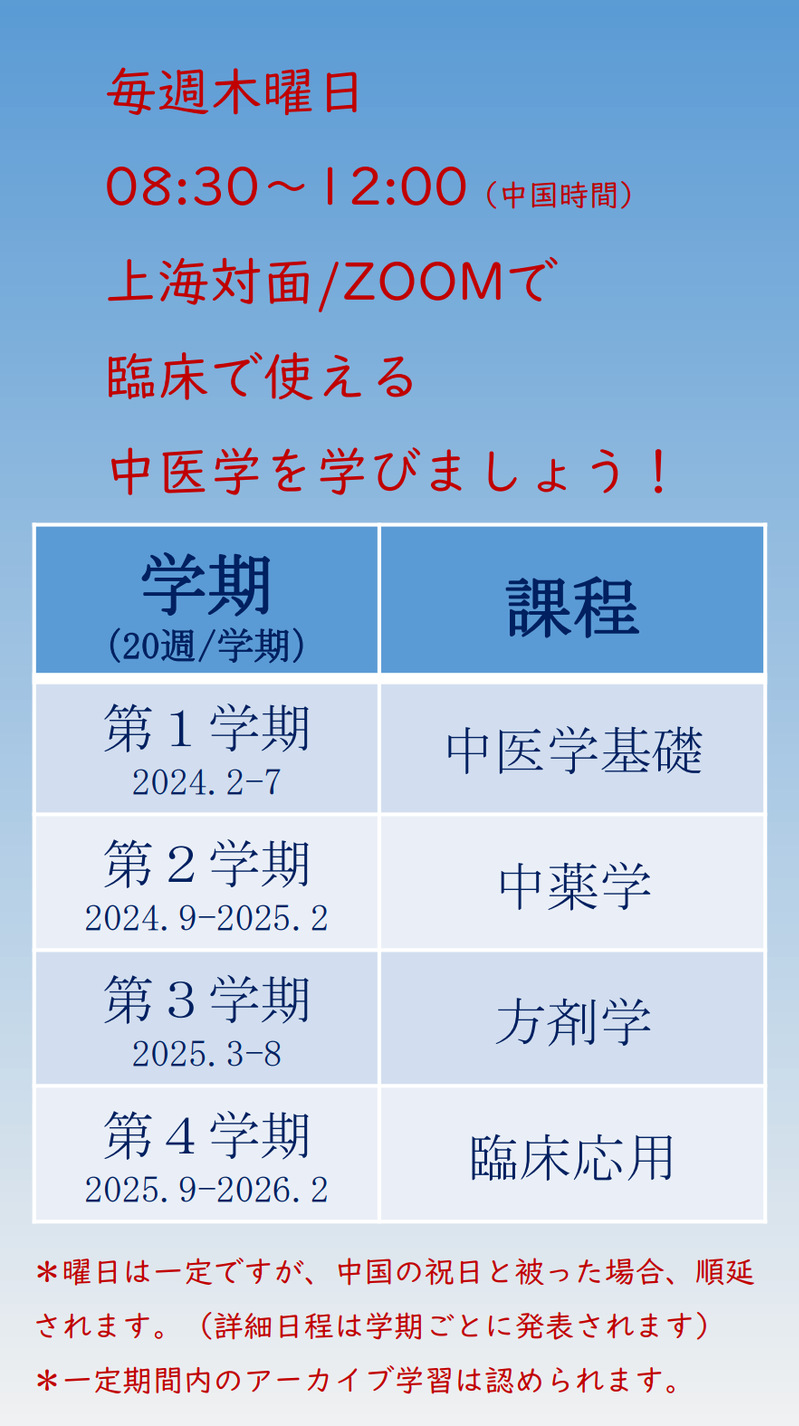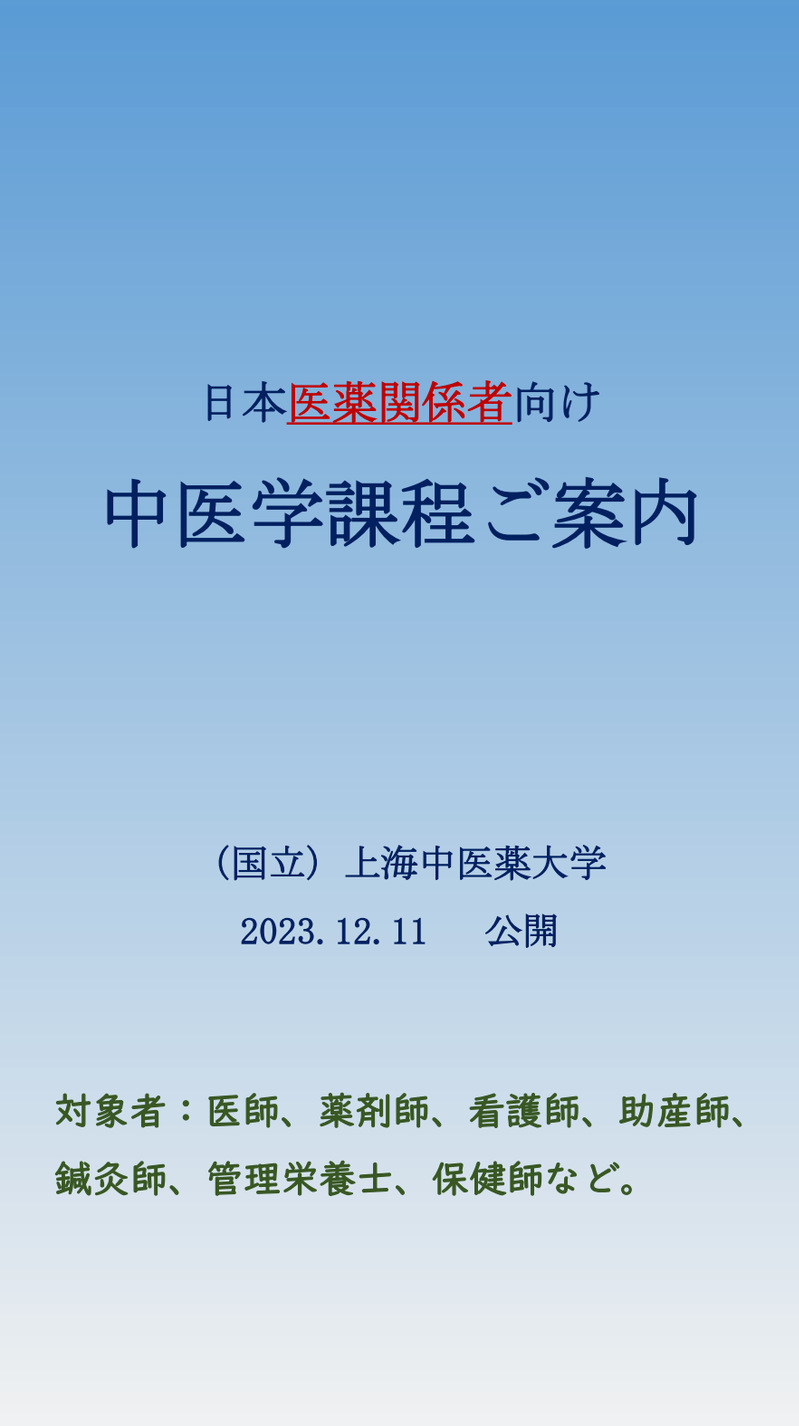 上海中医薬大学、日本医薬関係者向け中医学シリーズ課程(新規)、2024年より開講されます!中医学をしっかり学び、漢方薬の正しい処方方法をマスターし、実際の診療に役立てましょう!ご興味のある方や不明な点があれば、お気軽にお問い合わせください。